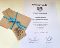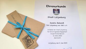 Am 04. Juni wurde Sandra Bebeniß, Schützin der Schützenabteilung des TSV Lütjenburg, von der Stadt Lütjenburg für ihr hervorragendes Engagement im sportlichen Bereich im Jahre 2023 geehrt. Sie erhielt aus den Händen der Bürgervorsteherin, Frau Jutta Zillmann, die Ehrenurkunde der Stadt Lütjenburg und ein Gutschein überreicht.